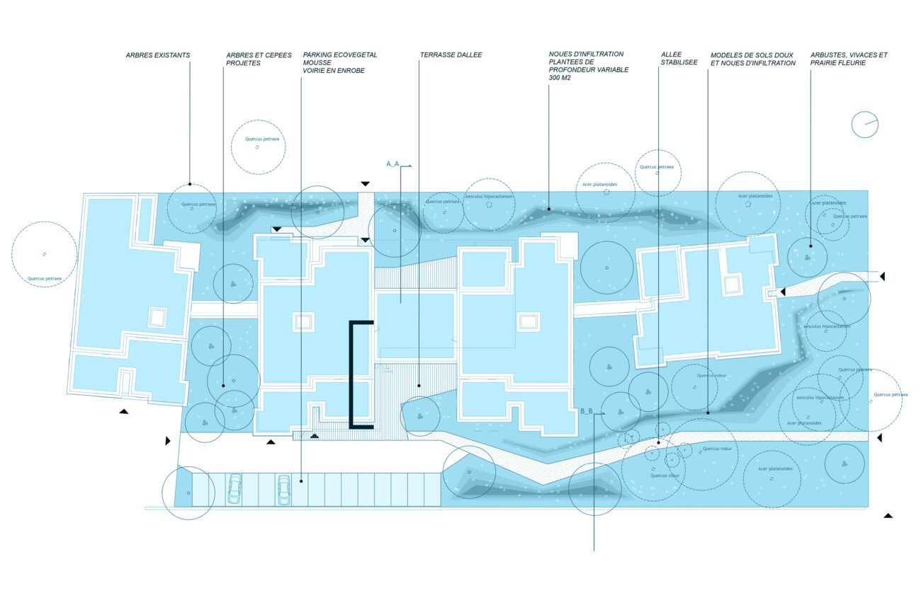 Située au cœur d'un écoquartier, la résidence s’inscrit de manière vernaculaire dans le paysage arboré du Parc Princesse. Le paysage est conçu de sorte à recevoir l’ensemble des eaux pluviales des bâtiments dans un réseau de larges noues fleuries. Une grande partie de la parcelle reste intouchée afin de préserver le patrimoine végétal exceptionnel du site en conservant les plus beaux arbres existants. Le projet paysager cherche à être en parfaite continuité avec ce paysage originel.