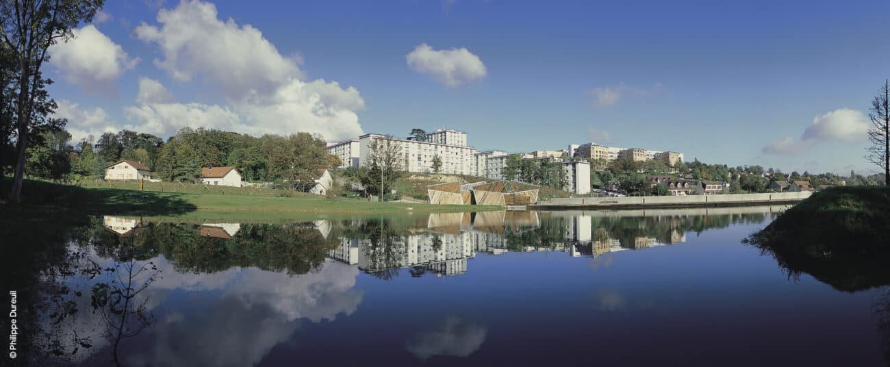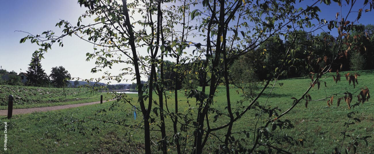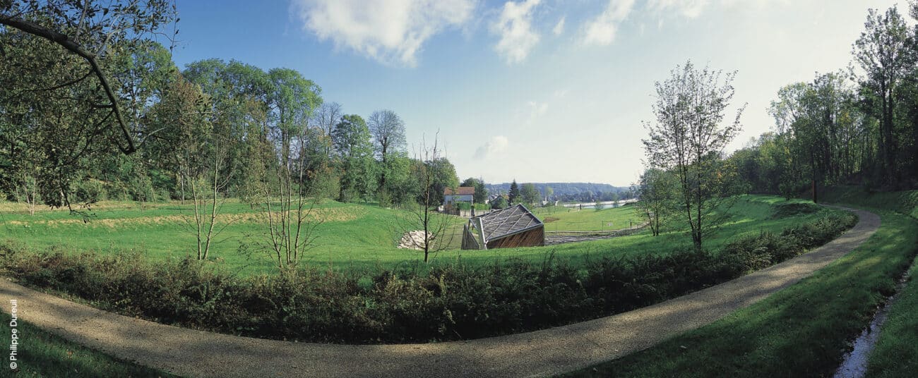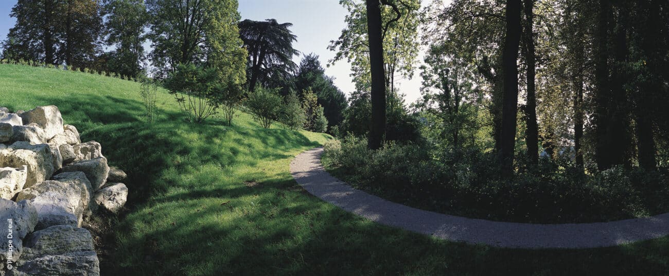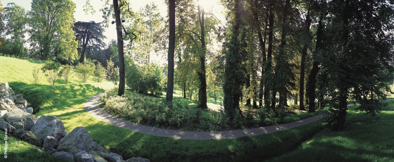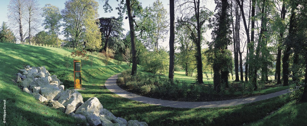 Le parc arboretum raconte une longue histoire de portes pensées comme des origamis (accrochant le parc au territoire urbain), de digue tendue entre deux quartiers générant deux étangs opposés, d’arbres racontant l’évolution du végétal présentée sur des cairns, de promenades comme des lanières souples qui visitent ces cairns un à un, d’un relief redessiné qui joue de la confrontation entre un flanc boisé, escarpé et sombre et une pente lissée et lumineuse et aussi de jardins chromatiques qui parlent de la variation infinie des couleurs, des feuillages et des fruits en toutes saisons. Le travail de conception du paysage a été accompagné par la création du logotype de l’arboretum, de la signalétique comprenant 23 panneaux descriptifs recto/verso (600 x 2 400 mm) avec 9 panneaux indicateurs recto/verso (260 x 2 400 mm) et des illustrations originales.
