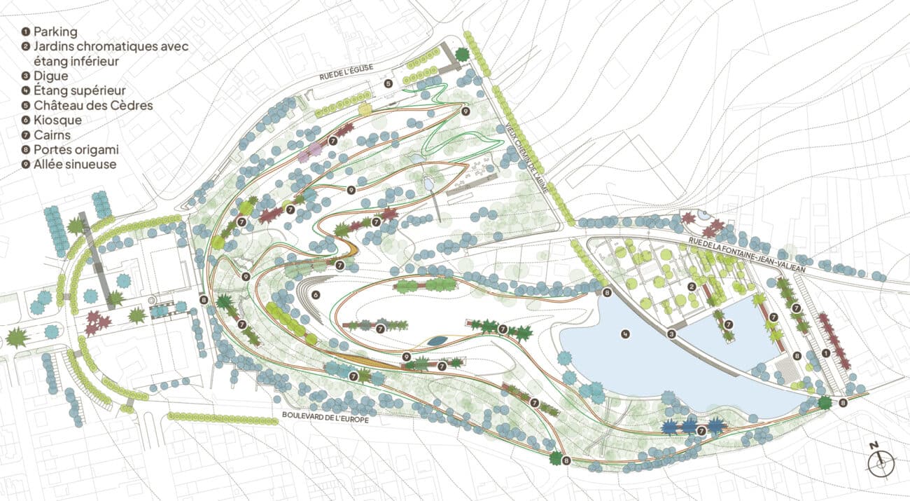 Maîtrise d'oeuvre : PASODOBLE (Architecte Paysagiste mandataire) + OGI (Bureau d’études) + AARTILL (Éclairagiste) + Pierre Grillet (spécialiste arboricole et forestier) + Sol Paysage (spécialiste des sols)