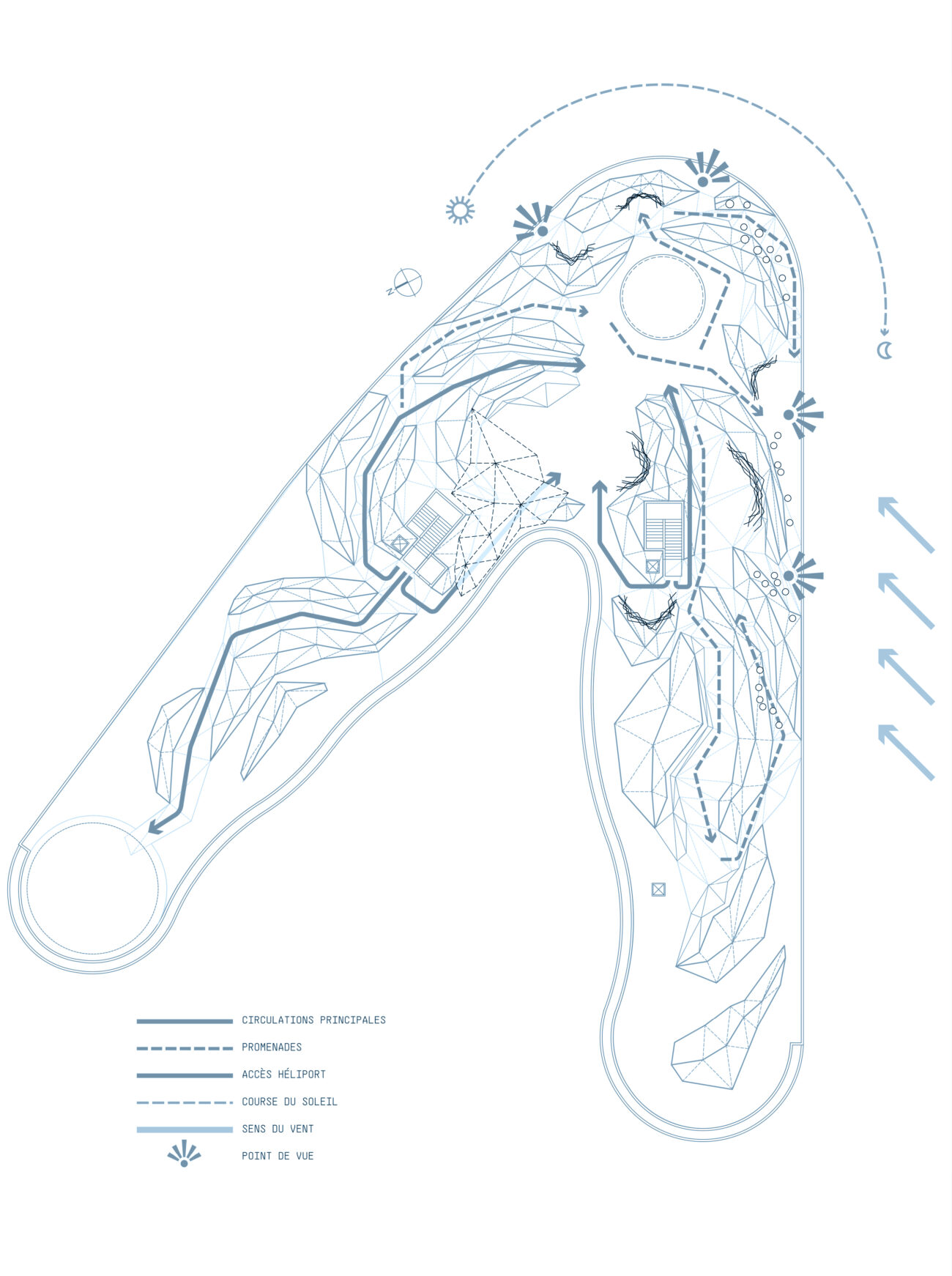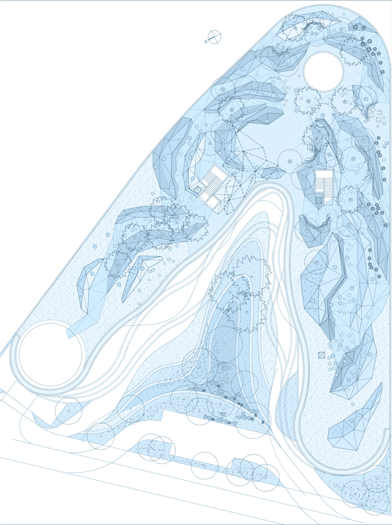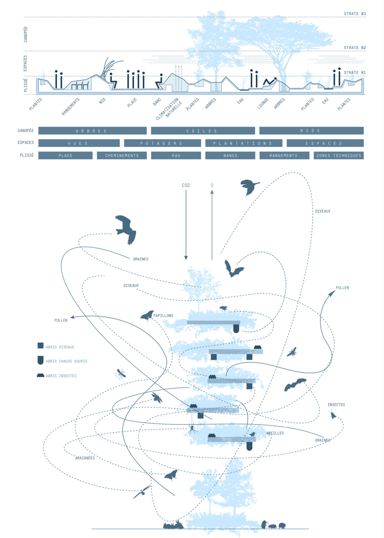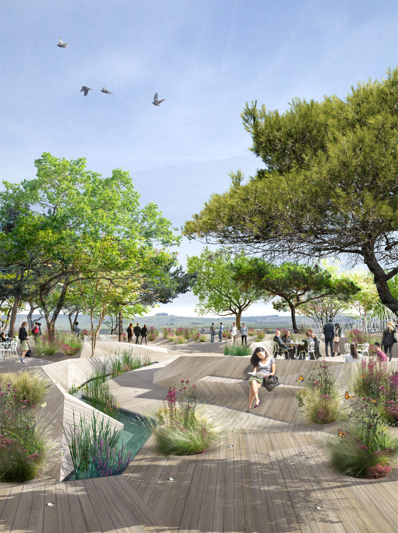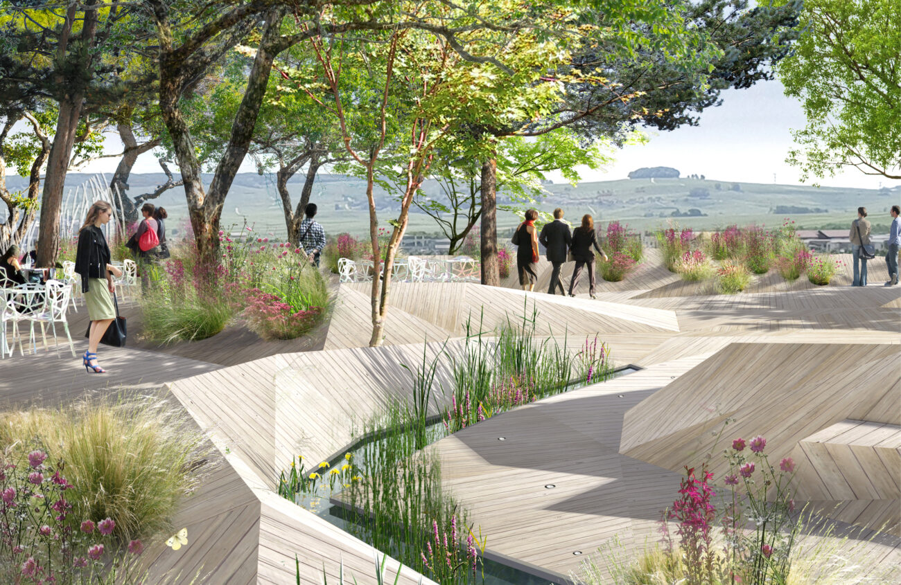 Plein Ciel témoigne de notre volonté de créer un paysage global, une entité vivante composée d’un vaste sol plissé dans les replis duquel s’insinuent les matières végétales et l’eau. Il est largement orienté sur le grand paysage pour générer un biome qui ouvre largement le champ à l’expansion de la biodiversité locale. Les biotopes qui s’installent sur Plein Ciel s’inscrivent sous la forme de vastes surfaces de végétation semi-extensives, de dunes en bois envahies d’une végétation plutôt rase et d’une constellation d’alvéoles parsemées dans le plissé d’où s’échappent les troncs des cépées, quelques arbustes, des mélanges de vivaces et de graminées. Le végétal Plein Ciel explore l’infinité des gris et des roses pourprés et s’exprime au travers du graphisme des textures des feuillages et des fleurs pour instaurer une signature végétale unique, qui, si elle n’est pas issue de la liste des plantes locales, sera tout de même mellifère, pollinifère, nourricière et parfumée.