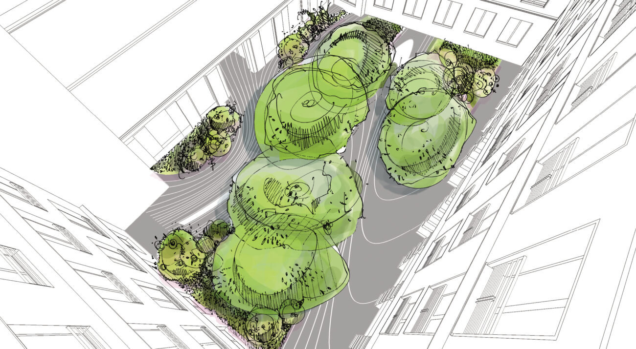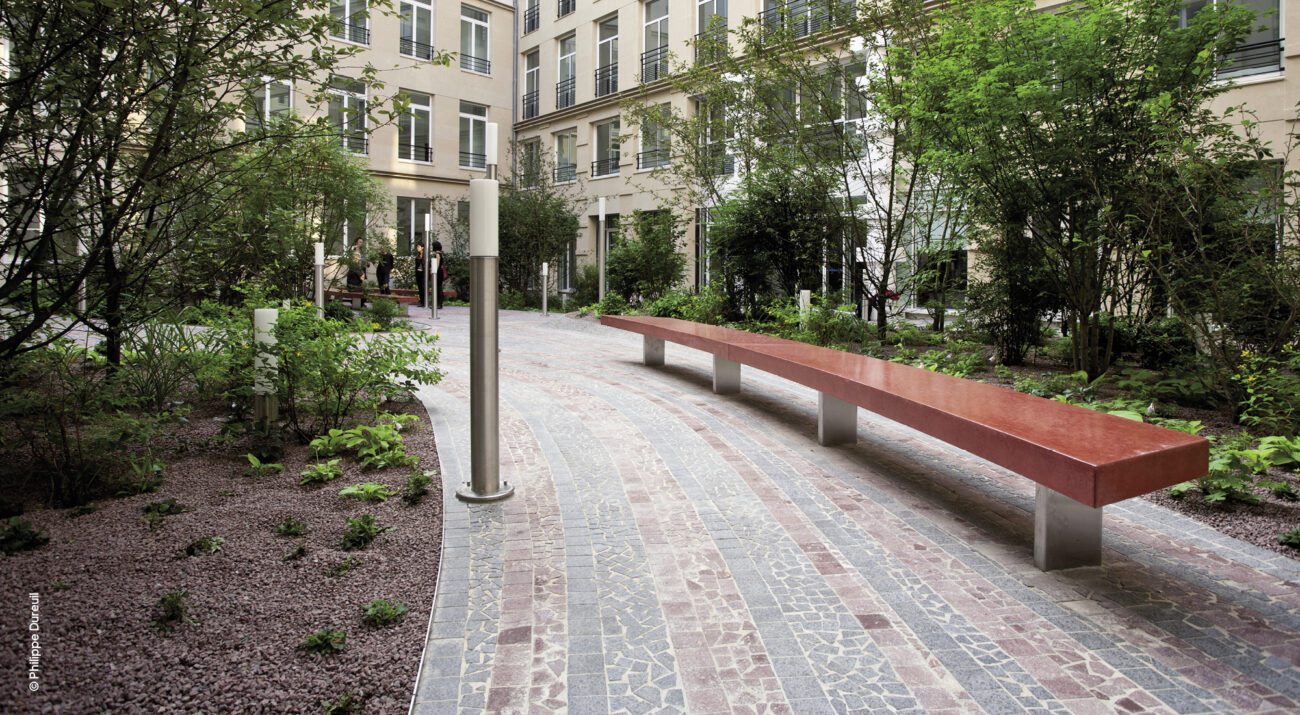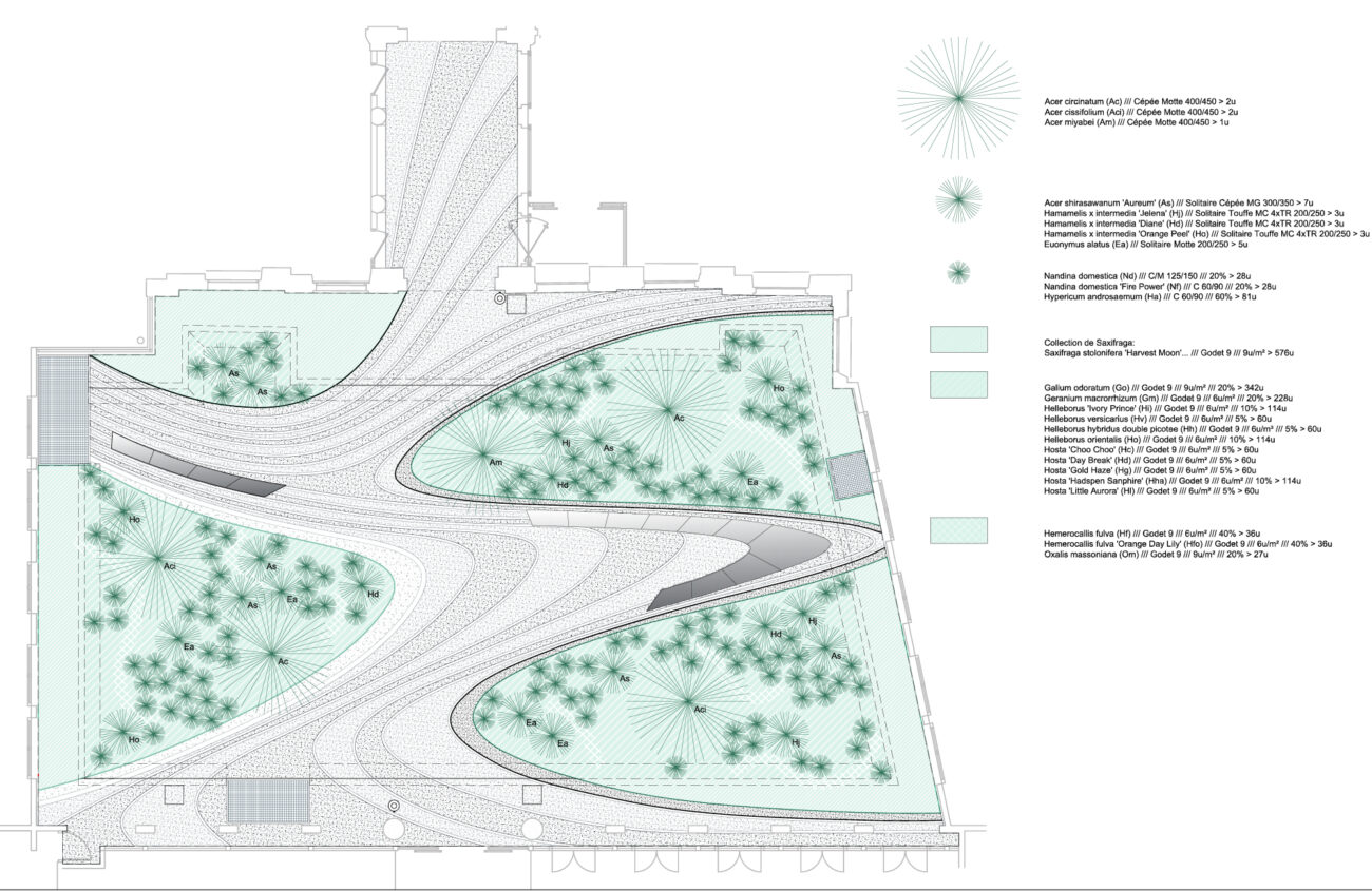 Ce jardin est tout en lignes fluides nées de l’apparition de quatre îles végétales attachées aux façades riveraines desquelles elles émergent. Elles se dessinent en creux légers ou en relief subtil, comme touchées par un mouvement ondulatoire impulsant un modelé à la surface du jardin. Les îles abritent la collection végétale du jardin : hêtres pourprés ou bicolores, érables du japon, fusain ailé, hortensia, roses d’Orient… retenus pour leurs couleurs chatoyantes, la délicatesse de leurs feuillages et de leurs floraisons. Ces plantes forment des avants et arrière-plans aux bureaux en rez-de-jardin, filtrent les vues en vis-à-vis et créent un spectacle toujours renouvelé lors des passages dans le jardin. Les circulations minérales, toutes en sinuosités, permettent malgré tout un accès direct d’un bâtiment à l’autre, tout en proposant des lieux privilégiés agrémentés de bancs, à l’abri entre deux îles.